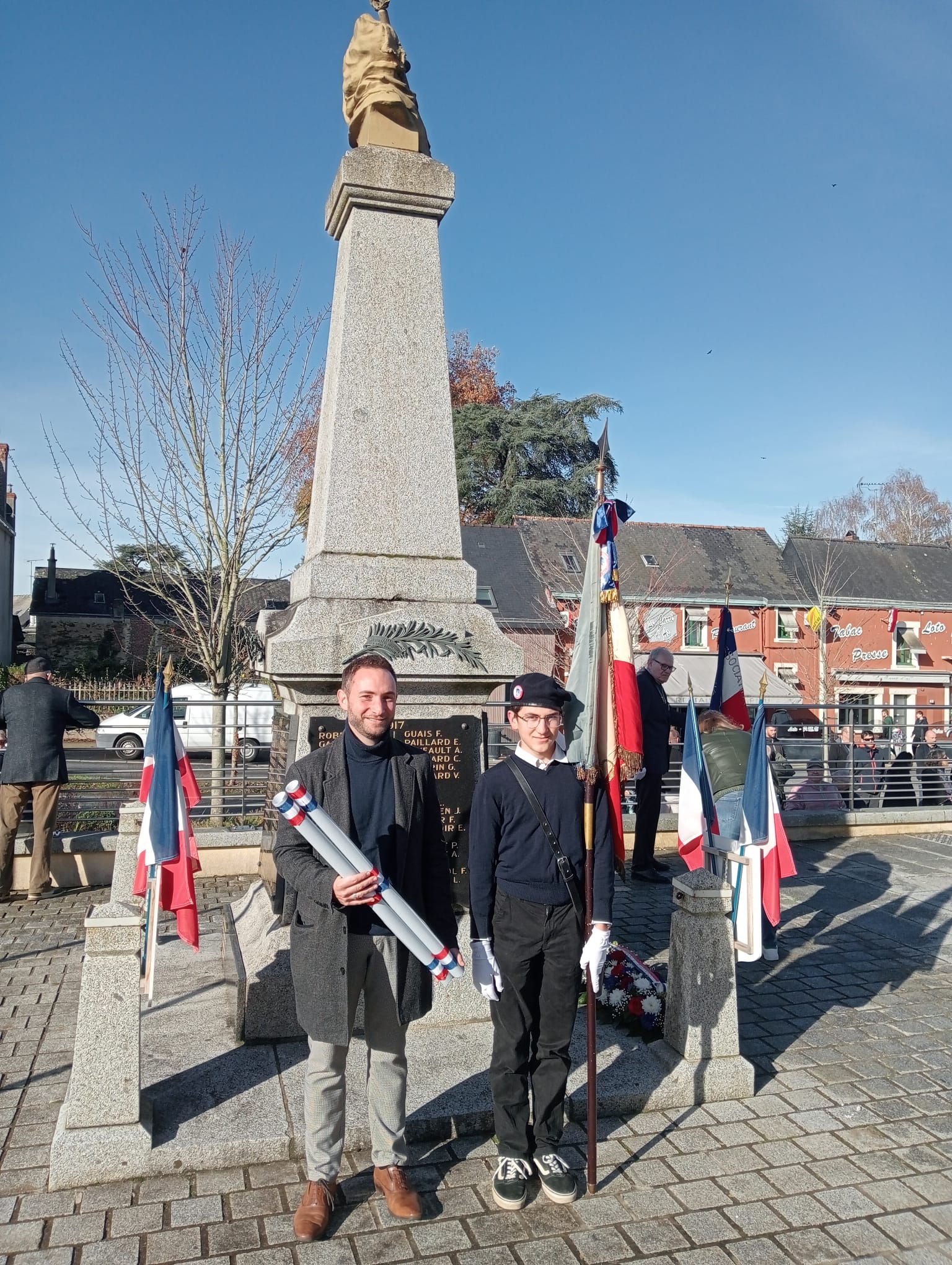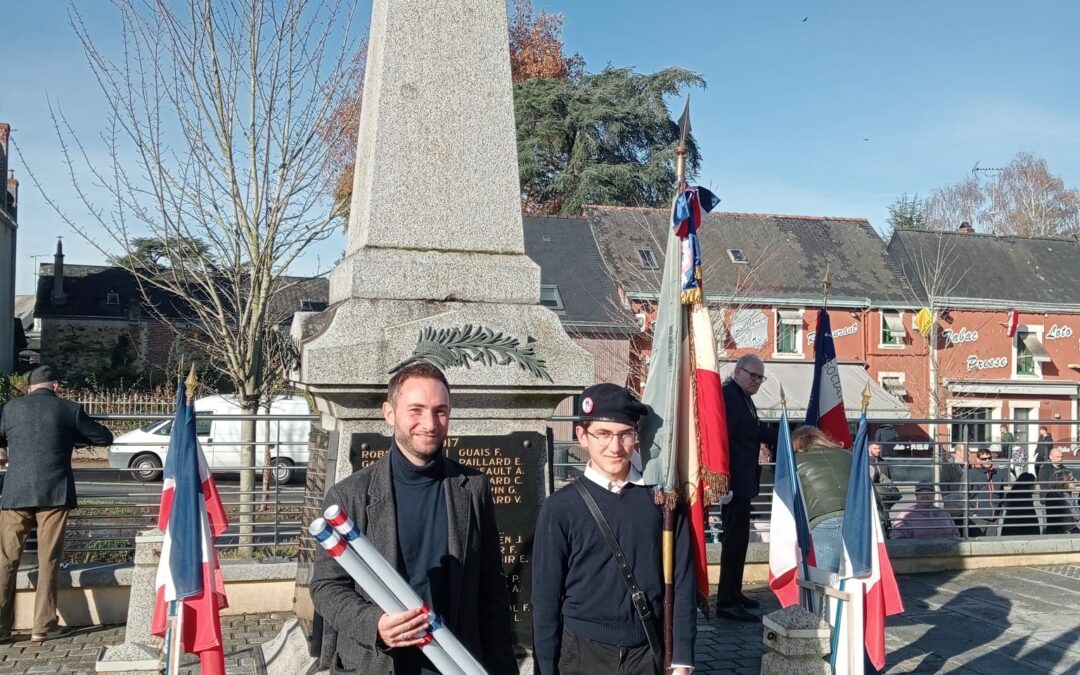 Le 11 novembre dernier, le Collège Saint Joseph de Cossé-le-Vivien a pris part à la cérémonie de commémoration de l’Armistice. Notre établissement était représenté avec fierté par Colomban, porte-drapeau officiel du collège, qui portait pour la seconde année consécutive le drapeau confié par l’association Le Souvenir Français.