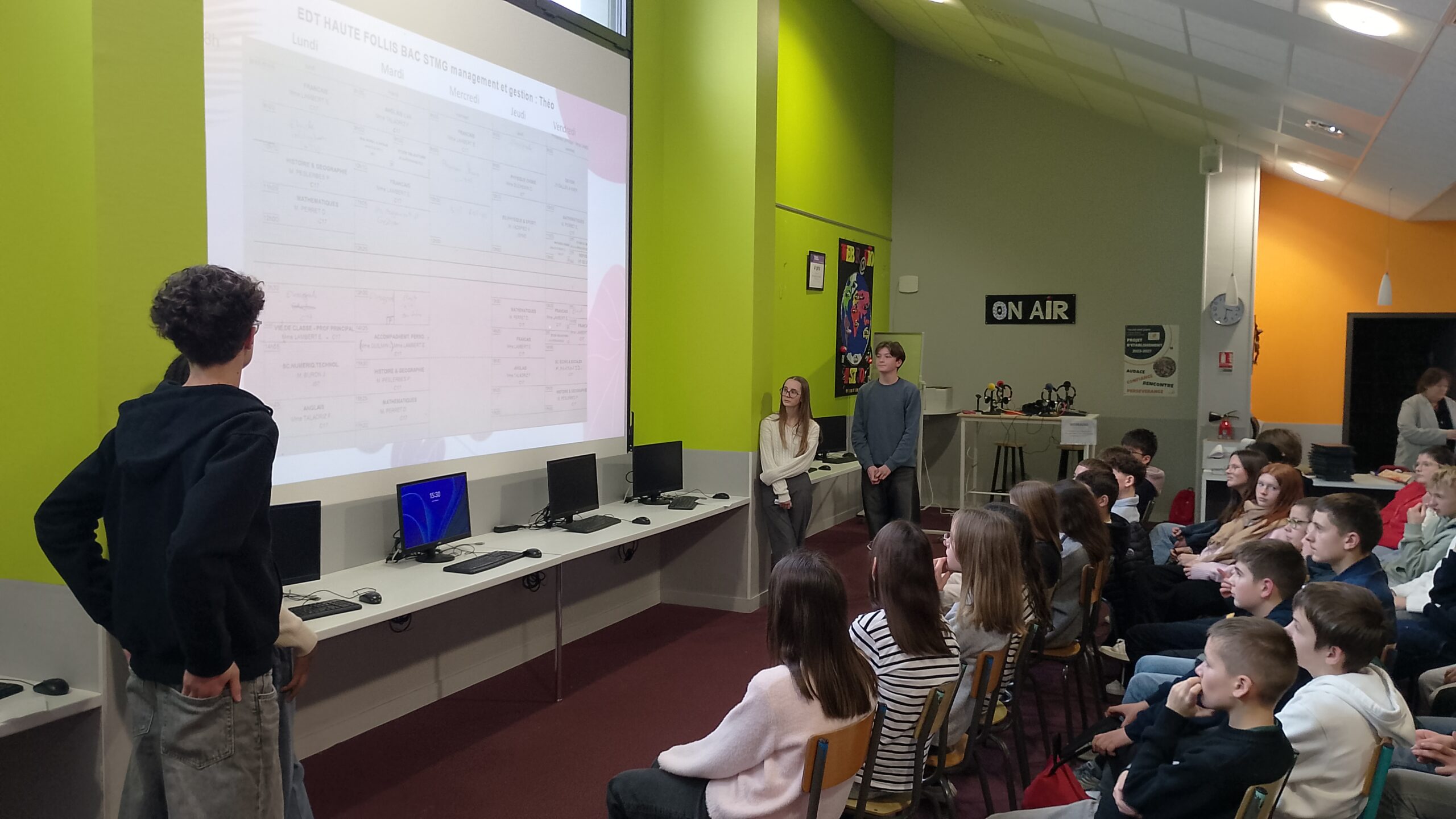 Ensuite, les troisièmes se sont dispatchés dans 2 salles en fonction de la voie vers laquelle ils souhaitent se diriger en septembre. Ils ont alors eu une présentation plus précise de chaque filière : générale, technologique et professionnelle.