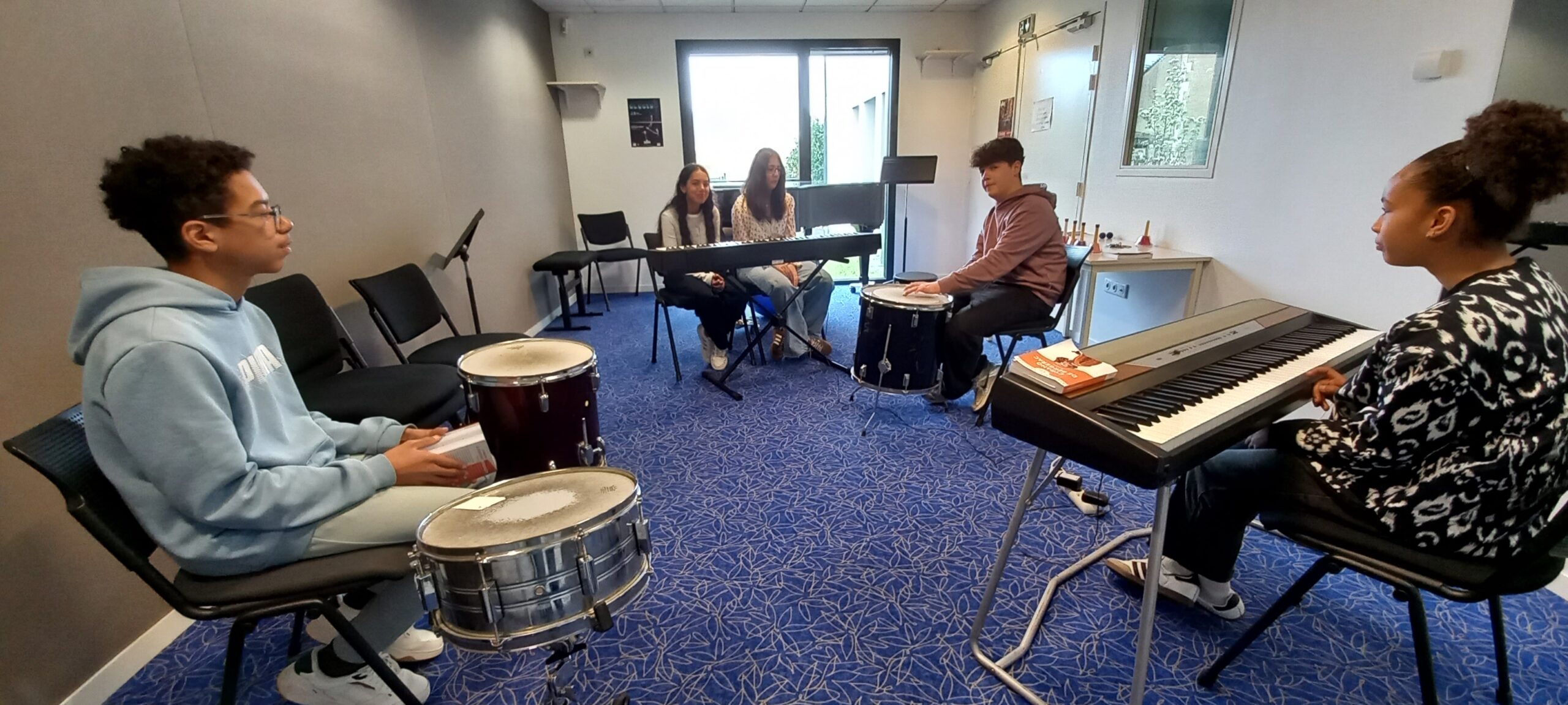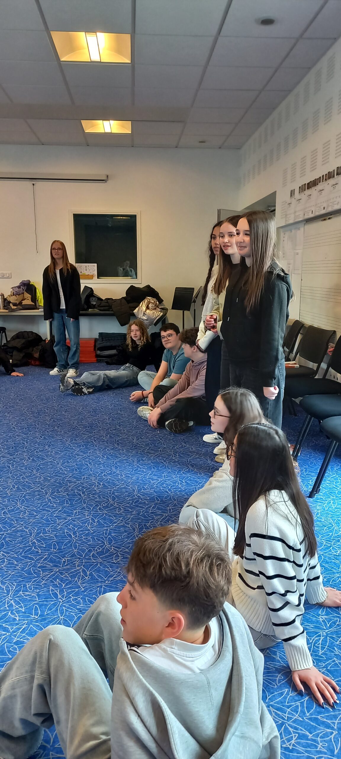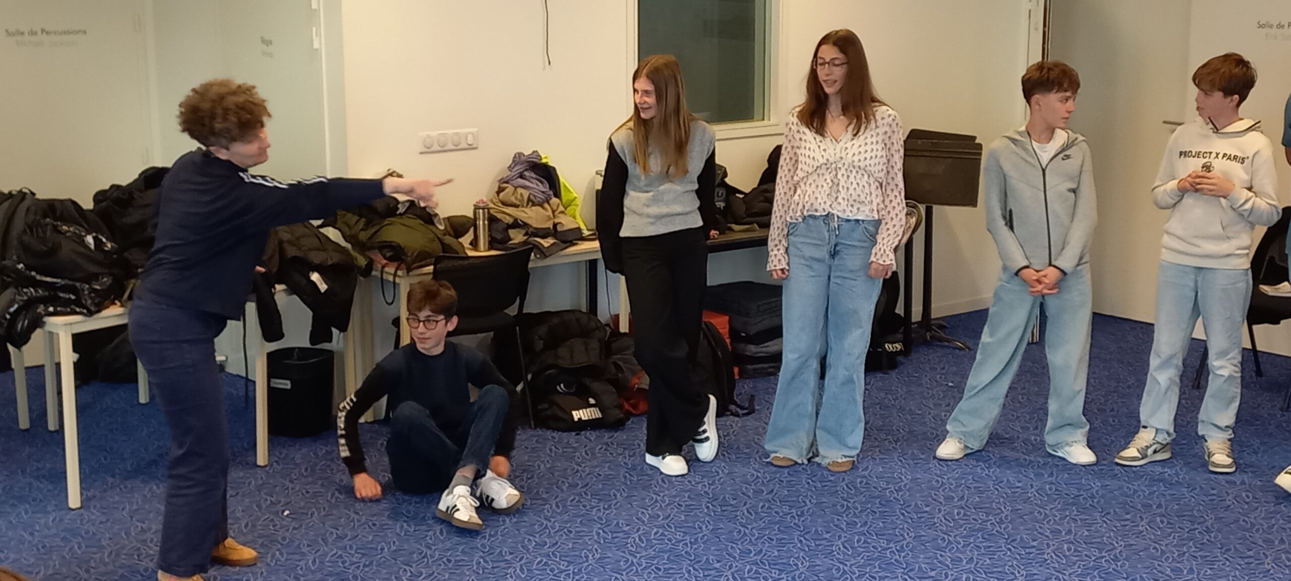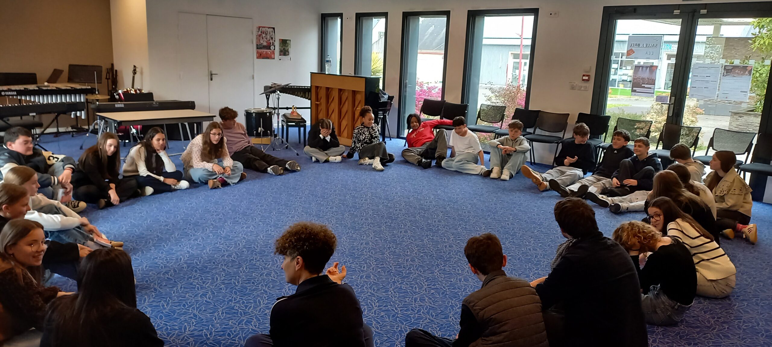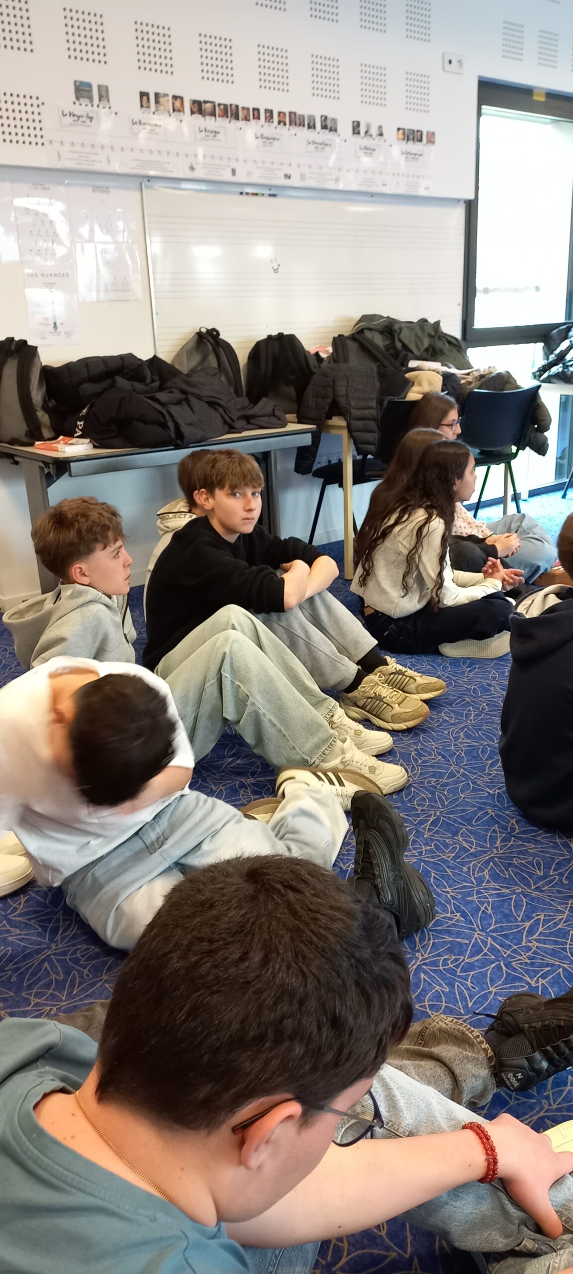 Parallèlement, un groupe d’élèves volontaires a travaillé sur l’illustration musicale de certains moments de la pièce. Ils ont conçu ambiances sonores et interventions musicales afin de renforcer émotions et dynamique de jeu.