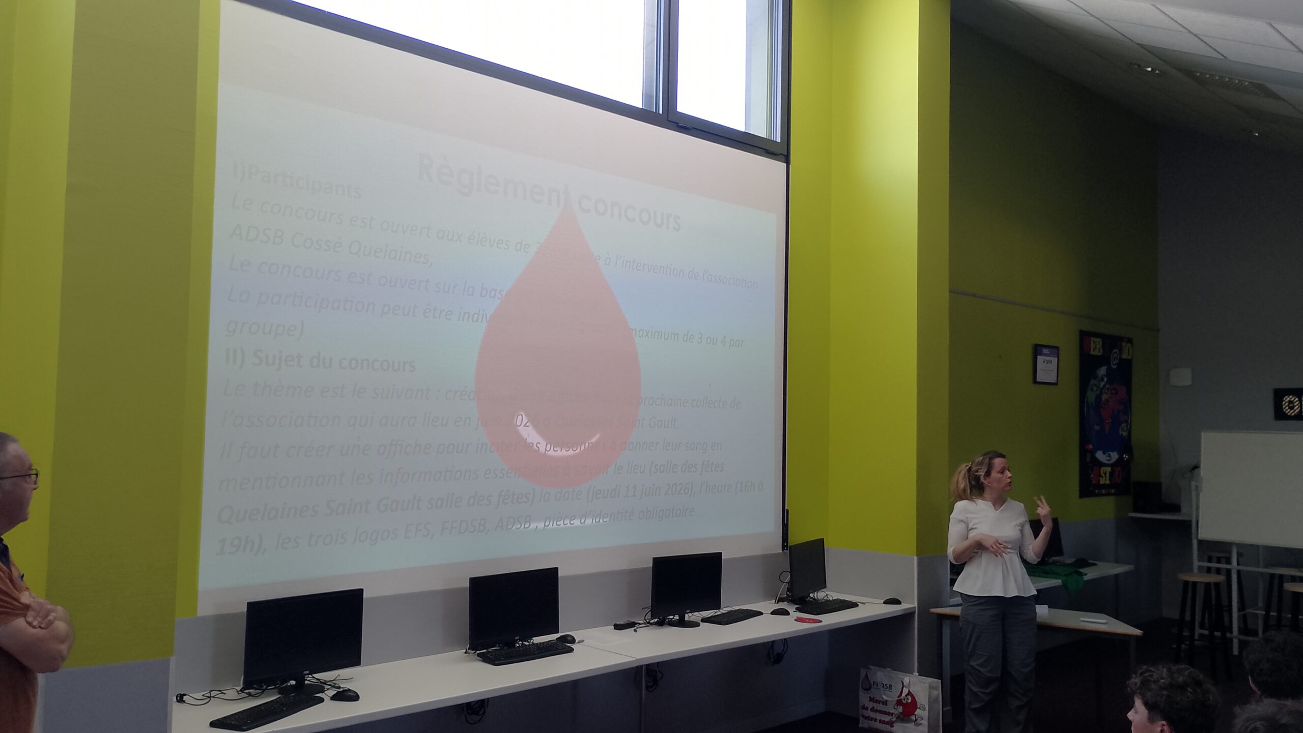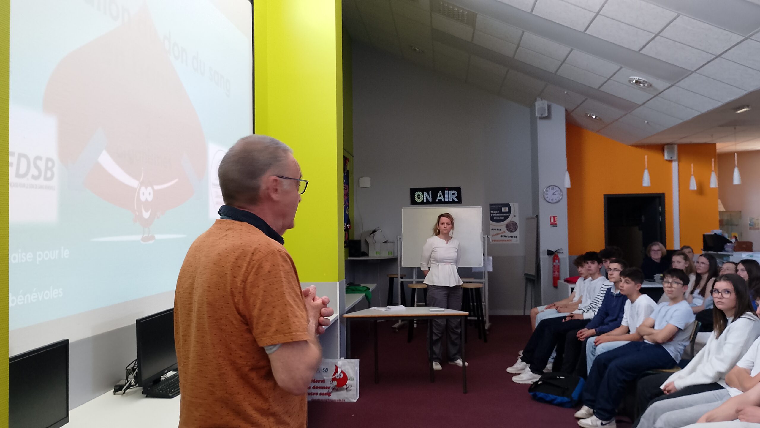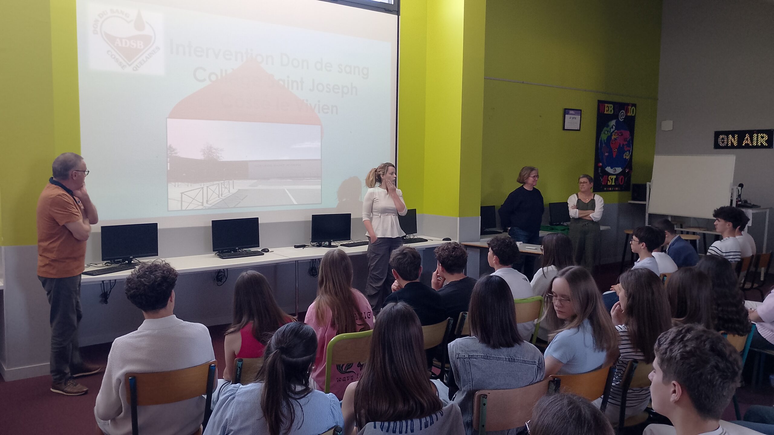 Ce mardi 7 avril, le collège a eu la chance de recevoir une partie de l’équipe des bénévoles de l’ADSB de Quelaines/Cossé le Vivien (dont Mme Collet, enseignante à St Jo) : « l’Association du Don de Sang des Bénévoles » pour échanger sur le don de sang.